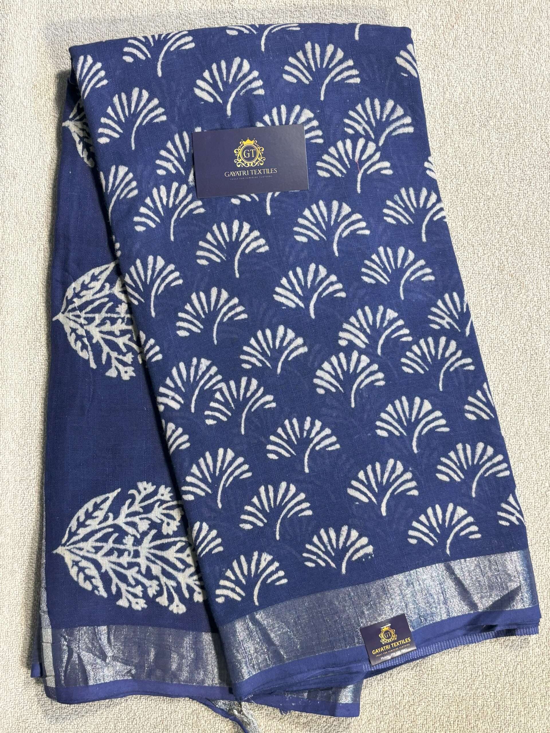 LINEN COTTON SAREE NAVY BLUE WITH BLOCK PRINTS AND SILVER ZARI WOVEN BORDER